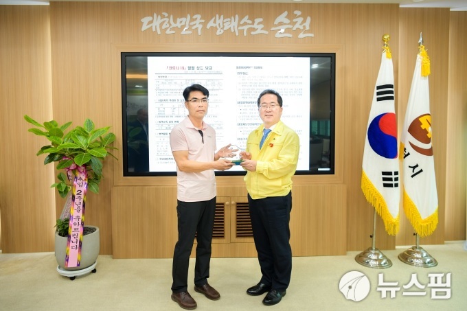 허석 순천시장이 '문화기부 1호' 기부자에게 감사패를 전달했다. [사진=순천시] 2020.07.27 wh7112@newspim.com