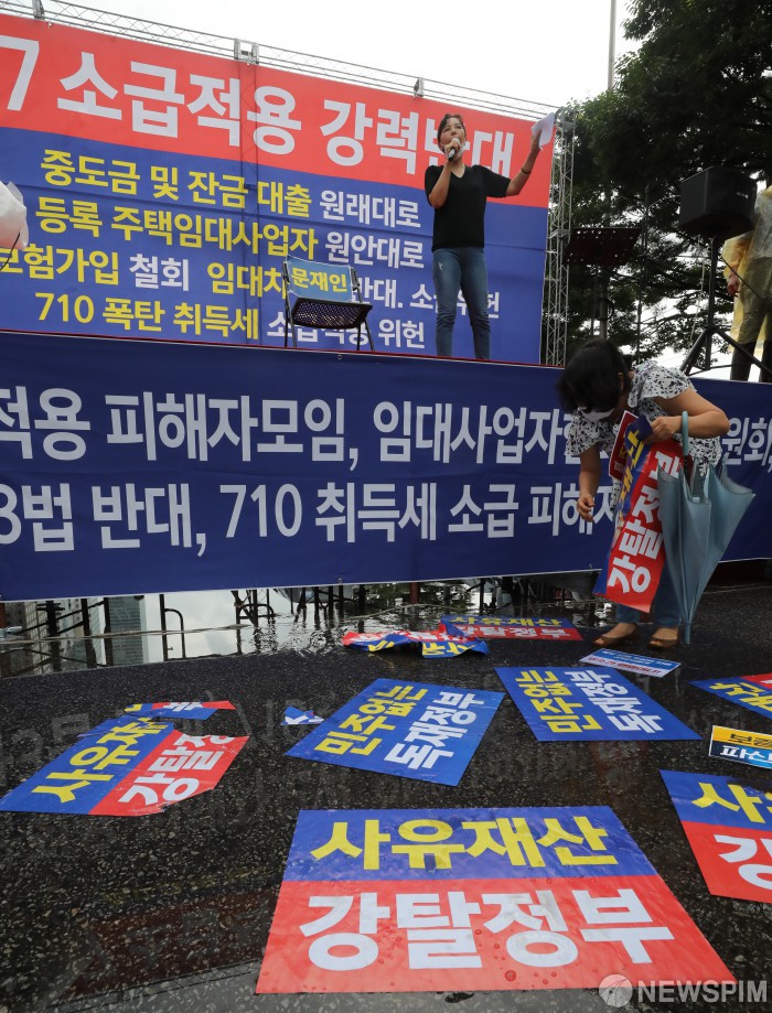 [서울=뉴스핌] 백인혁 기자 = '6.17 소급적용 피해자 구제를 위한 모임' 관계자들이 1일 오후 서울 영등포구 여의도공원 인근에서 정부의 부동산 정책 반대 집회 도중 문재인 대통령 탄핵 퍼포먼스를 하고 있다. 2020.08.01 dlsgur9757@newspim.com