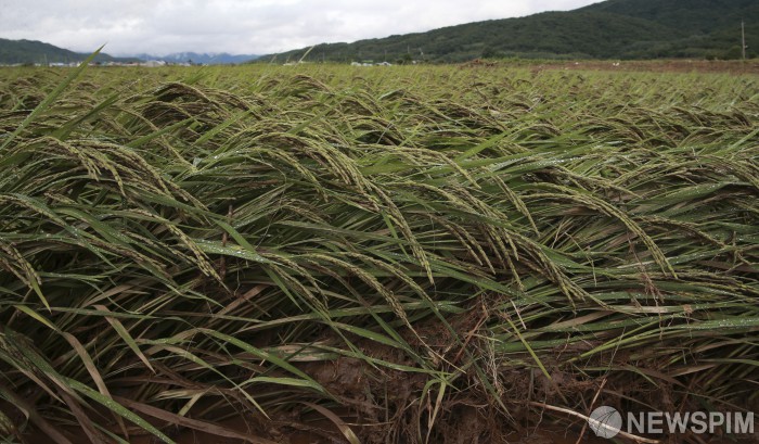 [철원=뉴스핌] 이형석 기자 = 6일 오후 폭우에 침수 피해가 난 강원도 철원군 동송읍 이길리 인근의 논에 벼가 쓰러져 있다. 2020.08.06 leehs@newspim.com