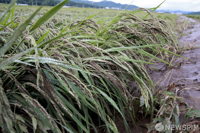 [철원=뉴스핌] 이형석 기자 = 6일 오후 폭우에 침수 피해가 난 강원도 철원군 동송읍 이길리 인의 논에 벼가 쓰러져 있다. 2020.08.06 leehs@newspim.com