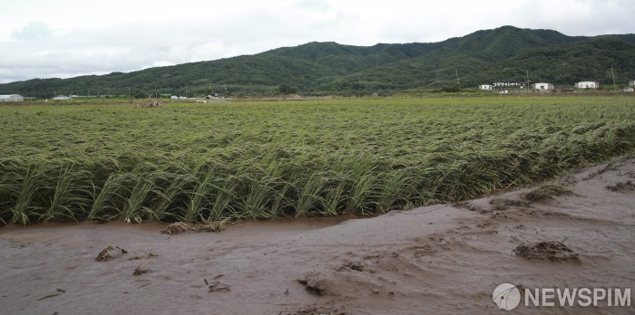 [철원=뉴스핌] 이형석 기자 = 6일 오후 폭우에 침수 피해가 난 강원도 철원군 동송읍 이길리 인의 논에 벼가 쓰러져 있다. 2020.08.06 leehs@newspim.com