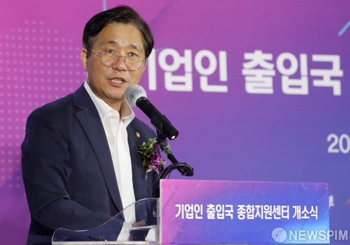 [서울=뉴스핌] 정일구 기자 = 성윤모 산업통상자원부 장관이 13일 오후 서울 강남구 코엑스에서 열린 기업인 출입국 종합지원센터 개소식에서 인사말을 하고 있다. 2020.08.13 mironj19@newspim.com