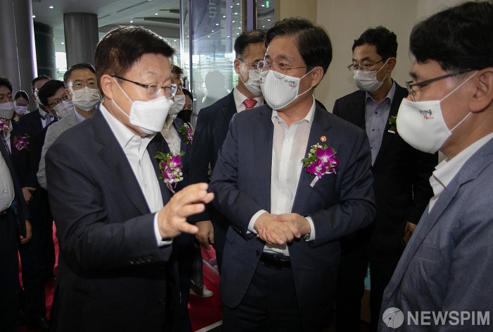 [서울=뉴스핌] 정일구 기자 = 성윤모 산업통상자원부 장관과 김영주 한국무역협회장이 13일 오후 서울 강남구 코엑스에서 개소한 기업인 출입국 종합지원센터를 둘러보고 있다. 2020.08.13 mironj19@newspim.com