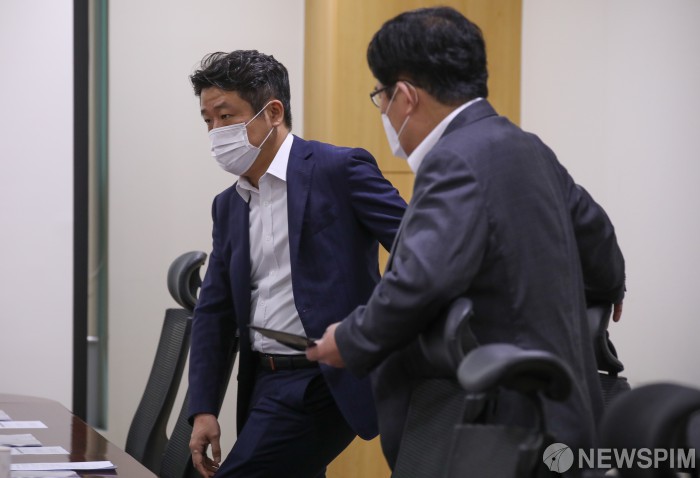 [서울=뉴스핌] 최상수 기자 = 유의동, 윤창현 미래통합당 의원이 19일 오전 서울 여의도 국회의원회관에서 열린 대신증권 라임펀드 관련 보고에 참석하고 있다. 2020.08.19 kilroy023@newspim.com
