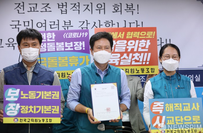 [서울=뉴스핌] 백인혁 기자 = 권정오 전국교직원노동조합 위원장(가운데)이 7일 오후 서울 서대문구 전국교직원노동조합(전교조) 본부 대회의실에서 열린 '전교조 법적 지위 회복! 다시 참교육 한길! 기자회견'에서 고용노동부에게 받은 '노동조합으로 보지 아니함 통보' 취소 알림 문서를 들어 보이고 있다. 2020.09.07 dlsgur9757@newspim.com