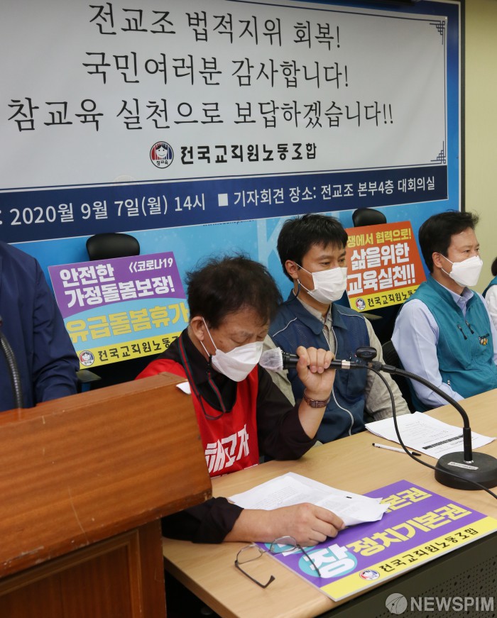[서울=뉴스핌] 백인혁 기자 = 손호만 전국교직원노동조합 해고자 원복투 위원장(왼쪽 첫번째)이 7일 오후 서울 서대문구 전국교직원노동조합(전교조) 본부 대회의실에서 열린 '전교조 법적 지위 회복! 다시 참교육 한길! 기자회견'에 참석해 발언하고 있다. 2020.09.07 dlsgur9757@newspim.com