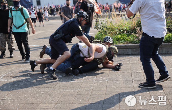 | [세일럼 로이터=뉴스핌] 이홍규 기자 = 미국 오리건 주 세일럼에 위치한 주 의회 의사당 인근에서 인종차별 반대 시위대와 도널드 트럼프 대통령 지지자들의 충돌이 벌어진 가운데 현장에 출동한 경찰이 이를 제지하고 있다. 2020.09.07 bernard0202@newspim.com |