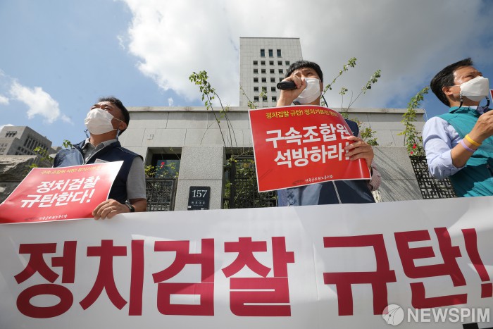 [서울=뉴스핌] 백인혁 기자 = 전국공무원노동조합 조합원들이 8일 오전 서울 서초구 대검찰청 앞에서 구속자석방! 정치검찰규탄! 정치기본권쟁취! 공무원노조 전국동시다발 기자회견을 하고 있다. 2020.09.08 dlsgur9757@newspim.com