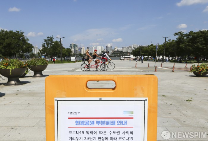 [서울=뉴스핌] 이한결 기자 = 서울시 한강사업본부는 8일 오후 2시부터 여의도·뚝섬·반포 등 주요 한강공원 내 밀집지역에 시민출입을 통제한다고 밝혔다. 코로나19 악화에 따른 수도권 사회적 거리두기 2.5단계 연장으로, 여의도 한강공원은 멀티프라자와 계절광장을 통제한다. 사진은 여의도 한강공원에 설치된 부분폐쇄 안내문. 2020.09.08 alwaysame@newspim.com