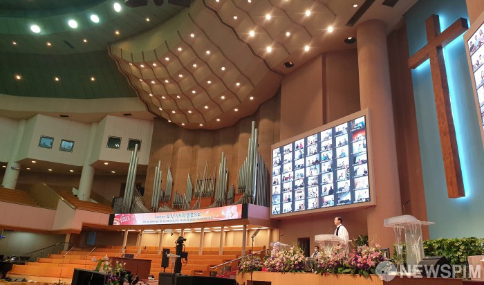 [서울=뉴스핌] 신종 코로나바이러스 감염증(코로나19) 확산으로 수도권 지역 교회가 비대면 예배만 허용된 가운데 13일 오전 서울 영등포구 여의도순복음교회 주일에배가 온라인 '줌(zoom)' 화상예배로 진행되고 있다. [사진=여의도순복음교회] 2020.09.09 photo@newspim.com