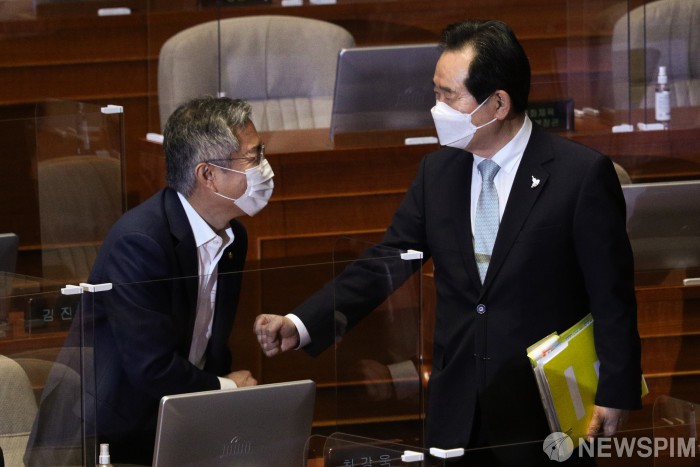 [서울=뉴스핌] 최상수 기자 = 정세균 국무총리와 최강욱 열린민주당 대표가 15일 오후 서울 여의도 국회에서 열린 외교·통일·안보 분야 대정부질문에서 인사를 하고 있다. 2020.09.15 kilroy023@newspim.com