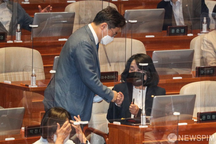 [서울=뉴스핌] 최상수 기자 = 윤미향 더불어민주당 의원이 15일 오후 서울 여의도 국회에서 열린 외교·통일·안보 분야 대정부질문에서 박찬대 의원과 주먹인사를 하고 있다. 2020.09.15 kilroy023@newspim.com