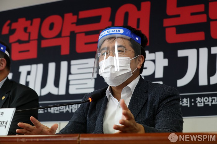 [서울=뉴스핌] 정일구 기자 = 첩약과학과 촉구 범의약회 비상대책위원회 관계자들이 17일 오전 서울 용산구 대한의사협회 임시회관에서 첩약급여 논란 대안 제시를 위한 기자회견을 하고 있다. 2020.09.17 mironj19@newspim.com