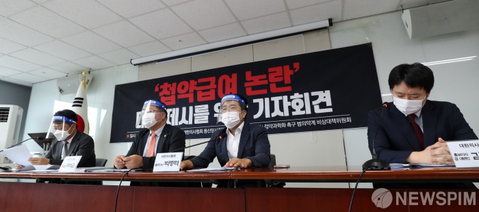 [서울=뉴스핌] 정일구 기자 = 첩약과학과 촉구 범의약회 비상대책위원회 관계자들이 17일 오전 서울 용산구 대한의사협회 임시회관에서 첩약급여 논란 대안 제시를 위한 기자회견을 하고 있다. 2020.09.17 mironj19@newspim.com