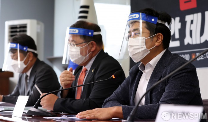 [서울=뉴스핌] 정일구 기자 = 첩약과학과 촉구 범의약회 비상대책위원회 관계자들이 17일 오전 서울 용산구 대한의사협회 임시회관에서 첩약급여 논란 대안 제시를 위한 기자회견을 하고 있다. 2020.09.17 mironj19@newspim.com