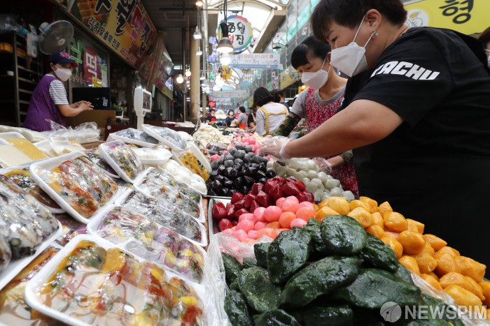 [인천=뉴스핌] 김학선 기자 = 추석을 10여 일 앞둔 20일 인천시 남동구 모래내시장의 한 떡집에서 장사 준비가 한창이다. 2020.09.20 yooksa@newspim.com