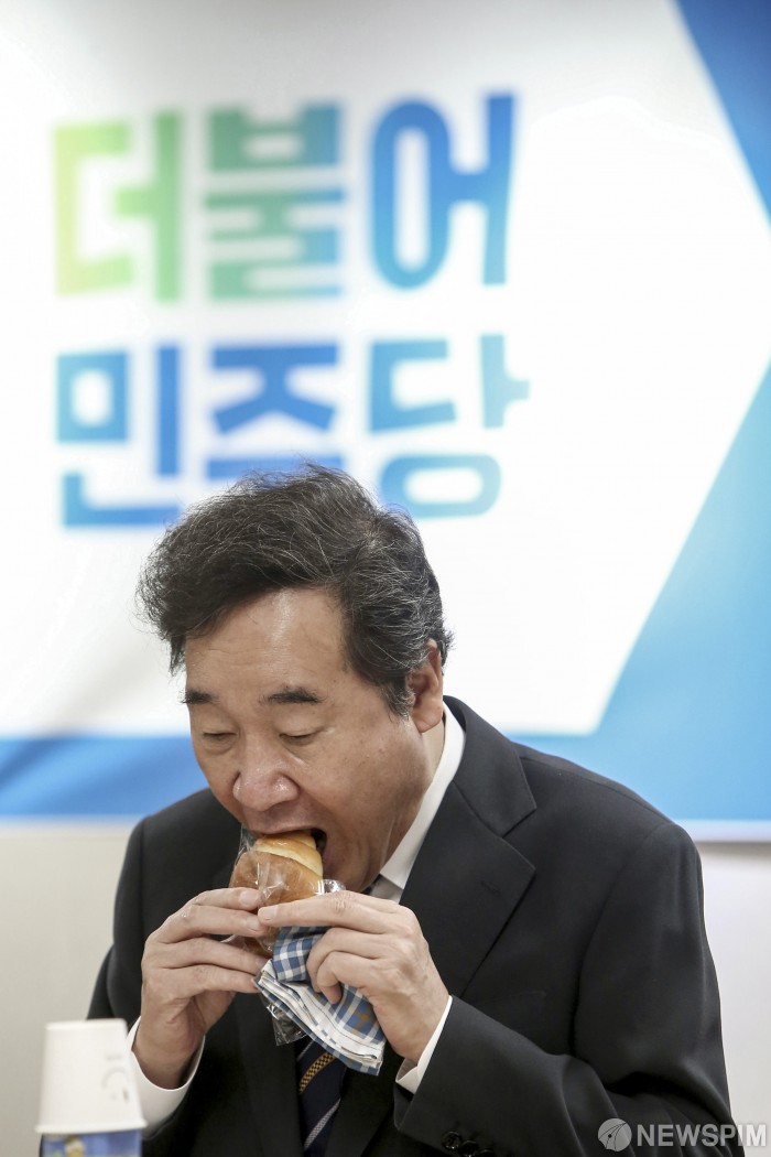 [서울=뉴스핌] 이형석 기자 = 더불어민주당 이낙연 대표가 22일 서울 여의도 서울시당에서 열린 ‘강북횡단선 추진 국회의원 모임 간담회’에 참석해 빵을 먹고 있다. 2020.09.22 leehs@newspim.com