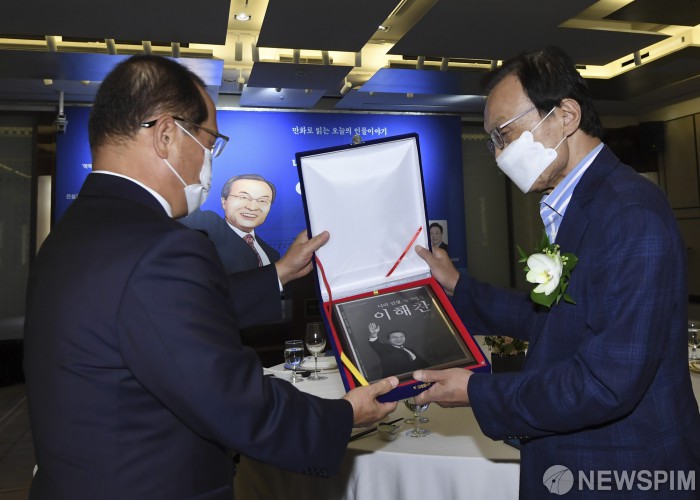 [서울=뉴스핌] 이형석 기자 = 황선우 산학연종합센터 센터장이 22일 오전 서울 중구 웨스턴조선호텔에서 열린 이해찬 전 더불어민주당 대표 전기 '나의 인생 국민에게' 발간 축하연에서 이 전 대표에게 발간 도서를 전달하고 있다. 2020.09.22 leehs@newspim.com