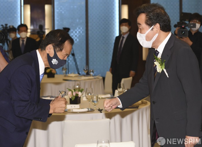 [서울=뉴스핌] 이형석 기자 = 이낙연 더불어민주당 대표(오른쪽)와 최문순 강원도지사가 22일 오전 서울 중구 웨스턴조선호텔에서 열린 이해찬 전 더불어민주당 대표 전기 '나의 인생 국민에게' 발간 축하연에서 주먹인사를 하고 있다. 2020.09.22 leehs@newspim.com