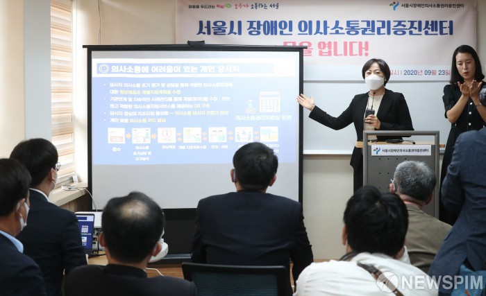 [서울=뉴스핌] 김학선 기자 = 23일 오후 서울 영등포구 중앙보훈회관에서 열린 '장애인 의사소통 권리증진센터' 개소식에서 김경양 센터장이 사업소개를 하고 있다. 서울시는 이날 의사소통이 곤란한 장애인들이 불편 없이 의사표현을 할 수 있도록 전문적 서비스를 제공하는 '장애인 의사소통 권리증진센터'를 개소했다. 2020.09.23 yooksa@newspim.com