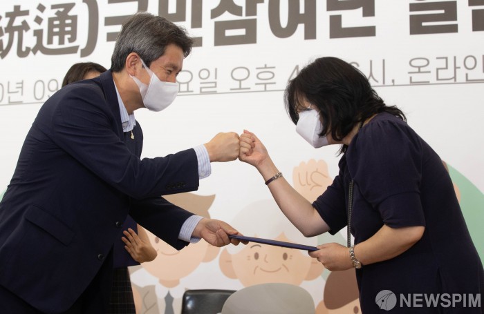 [서울=뉴스핌] 윤창빈 기자 = 이인영 통일부 장관이 23일 오후 서울 종로구 정부서울청사 별관에서 열린 통통국민참여단 열린 포럼에서 위촉장을 수여하고 인사를 나누고 있다. 2020.09.23 pangbin@newspim.com
