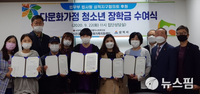 [삼척=뉴스핌] 이형섭 기자 = 법무부 법사랑 삼척지구협의회는 지난 22일 다문화가정 청소년 5명에게 장학금 150만원을 전달했다. 협의회는 매년 다문화한마당 축제에서 150만원 상당의 경품을 후원했으나 올해는 코로나19로 축제가 취소돼 장학금으로 대체했다.[사진=삼척시건강가정다문화가족지원센터]2020.09.23 onemoregive@newspim.com
