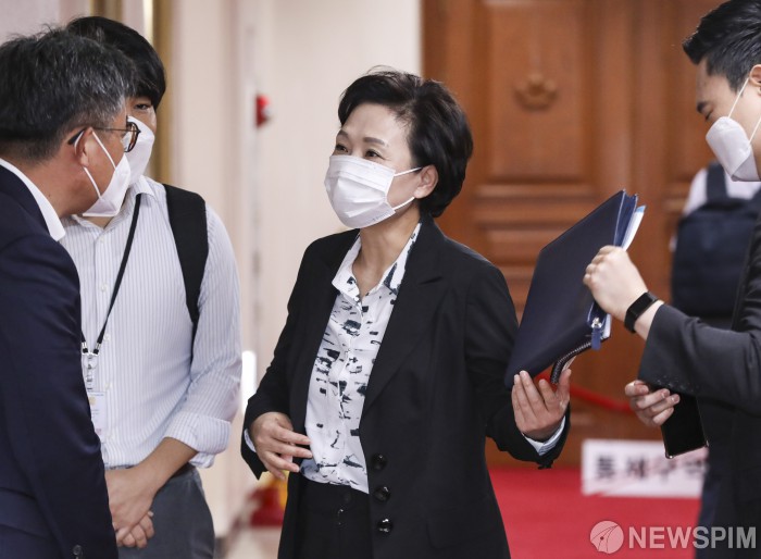 [서울=뉴스핌] 이한결 기자 = 김현미 국토교통부 장관이 24일 오전 서울 종로구 정부서울청사에서 열린 국정현안조정회의에 입장하기 전 관계자와 대화를 나누고 있다. 2020.09.24 alwaysame@newspim.com