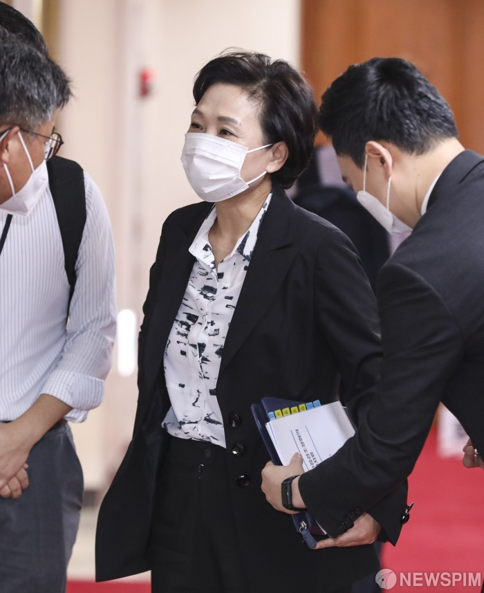 [서울=뉴스핌] 이한결 기자 = 김현미 국토교통부 장관이 24일 오전 서울 종로구 정부서울청사에서 열린 국정현안조정회의에 입장하기 전 관계자와 대화를 나누고 있다. 2020.09.24 alwaysame@newspim.com