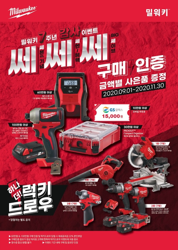 [서울=뉴스핌] 오경진 기자 = 프리미엄 전동공구 브랜드 밀워키가 당초 9월말까지 계획했던 창립 7주년 기념 '쎄.쎄.쎄. 이벤트'를 11월말까지 연장한다고 30일 밝혔다.