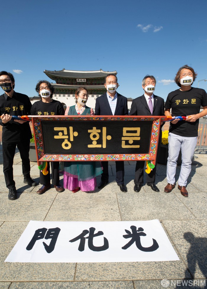 [서울=뉴스핌] 윤창빈 기자 = 광화문 현판 훈민정음체로 시민모임이 8일 오후 서울 종로구 광화문광장에서 광화문 현판을 ’門化光‘ 대신 훈민정음체 한글 ’광화문‘으로 변경하길 촉구하는 기자회견을 개최하고 퍼포먼스를 하고 있다. 2020.10.08 pangbin@newspim.com