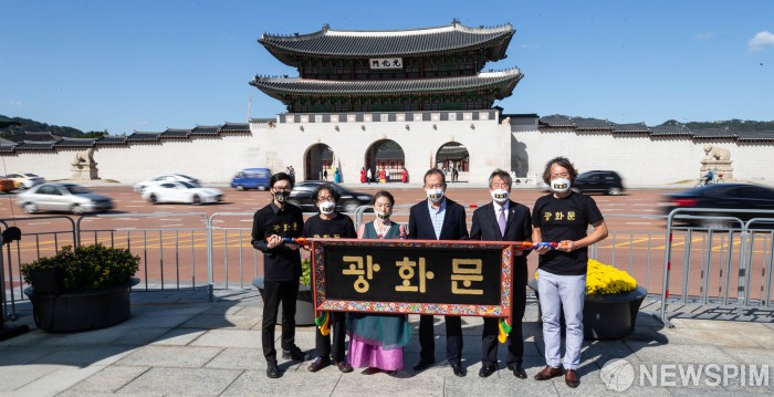 [서울=뉴스핌] 윤창빈 기자 = 광화문 현판 훈민정음체로 시민모임이 8일 오후 서울 종로구 광화문광장에서 광화문 현판을 ’門化光‘ 대신 훈민정음체 한글 ’광화문‘으로 변경하길 촉구하는 기자회견을 개최하고 퍼포먼스를 하고 있다. 2020.10.08 pangbin@newspim.com