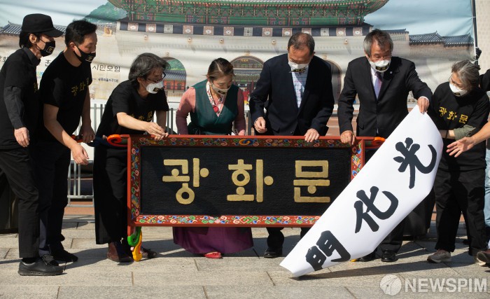 [서울=뉴스핌] 윤창빈 기자 = 광화문 현판 훈민정음체로 시민모임이 8일 오후 서울 종로구 광화문광장에서 광화문 현판을 ’門化光‘ 대신 훈민정음체 한글 ’광화문‘으로 변경하길 촉구하는 기자회견을 개최하고 퍼포먼스를 하고 있다. 2020.10.08 pangbin@newspim.com