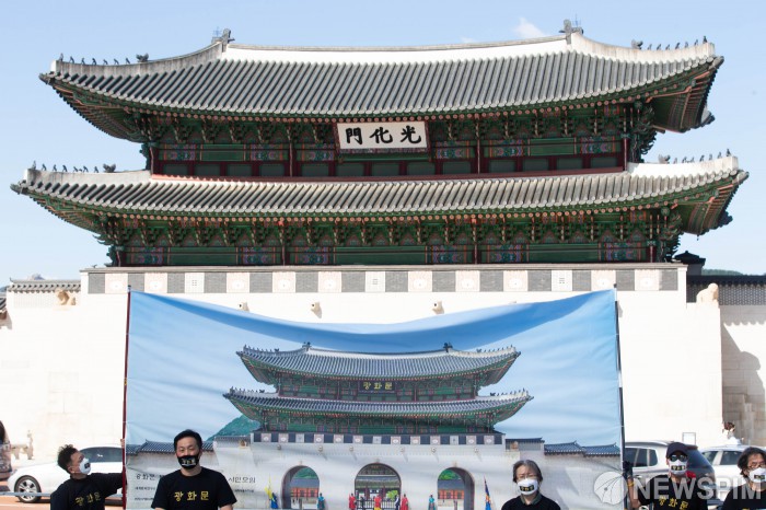 [서울=뉴스핌] 윤창빈 기자 = 광화문 현판 훈민정음체로 시민모임이 8일 오후 서울 종로구 광화문광장에서 광화문 현판을 ’門化光‘ 대신 훈민정음체 한글 ’광화문‘으로 변경하길 촉구하는 기자회견을 개최하고 퍼포먼스를 하고 있다. 2020.10.08 pangbin@newspim.com