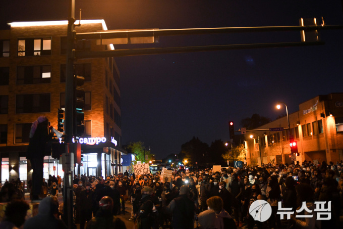 [미니애폴리스 로이터=뉴스핌] 이홍규 기자 = 미국 흑인 남성 조지 플로이드 씨를 살해한 혐의로 기소된 데릭 쇼빈 전 미니애폴리스 경찰관이 교정시설에서 보석금을 내고 풀려난 것에 대해 항의하는 시위가 미니애폴리스에서 벌어졌다. 2020.10.07 bernard0202@newspim.com
