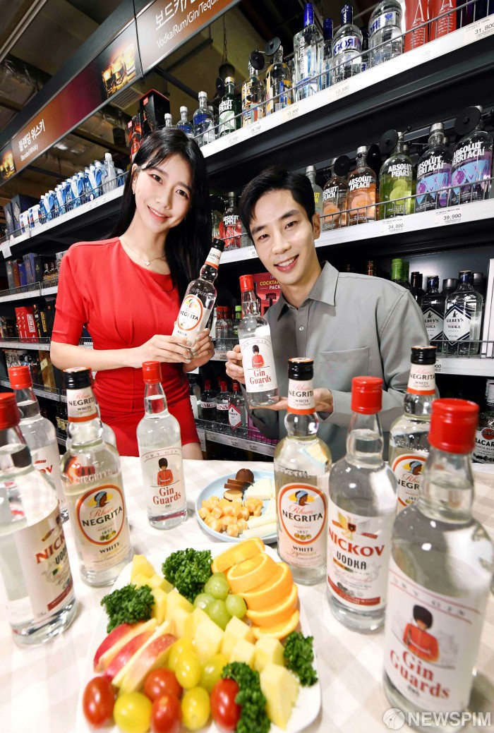 [서울=뉴스핌] 13일 오전 서울 강서구 홈플러스 강서점에서 모델들이 유럽산 보드카와 럼, 진 신상품을 선보이고 있다. 홈플러스는 합리적인 가격으로 가정에서 간편하게 칵테일로 즐기기 좋은 ‘니코브 보드카(700ml, 9,900원)’, ‘진 가드(700ml, 9,900원)’, ‘네그리타 화이트 럼(700ml, 1만4,900원)’을 판매한다. [사진=홈플러스] 2020.10.13 alwaysame@newspim.com
