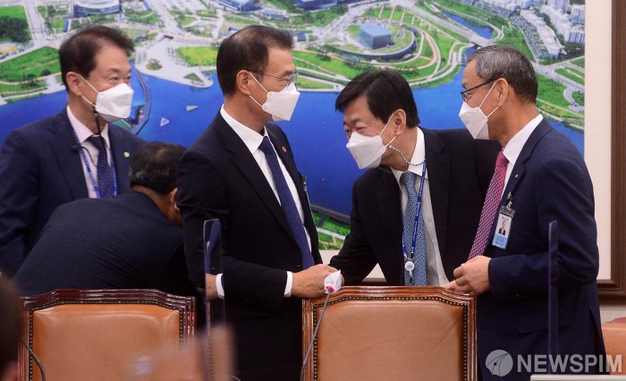 [서울=뉴스핌] 이한결 기자 = 김학규 한국감정원 원장(오른쪽)이 19일 오전 서울 여의도 국회 국토교통위원회에서 열린 국정감사에 출석해 참석자들과 인사하고 있다. 2020.10.19 alwaysame@newspim.com