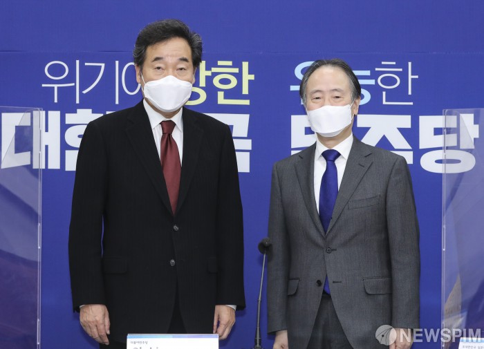 [서울=뉴스핌] 이한결 기자 = 이낙연 더불어민주당 대표(왼쪽)가 22일 오전 서울 여의도 국회에서 도미타 코지 주한 일본대사를 접견하기 앞서 함께 기념촬영을 하고 있다. 2020.10.22 alwaysame@newspim.com