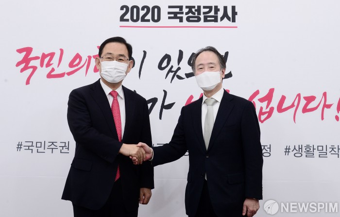[서울=뉴스핌] 이한결 기자 = 주호영 국민의힘 원내대표가 23일 오후 서울 여의도 국회에서 예방한 도미타 코지 주한 일본대사와 함께 기념촬영을 하고 있다. 2020.10.23 alwaysame@newspim.com