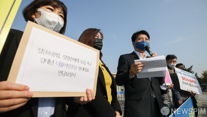 [서울=뉴스핌] 최상수 기자 = 오기형 더불어민주당 의원이 26일 오전 서울 여의도 국회 앞에서 열린 '집단소송법 등 소비자권익 3법' 입법 촉구 기자회견에서 발언하고 있다. 2020.10.26 kilroy023@newspim.com