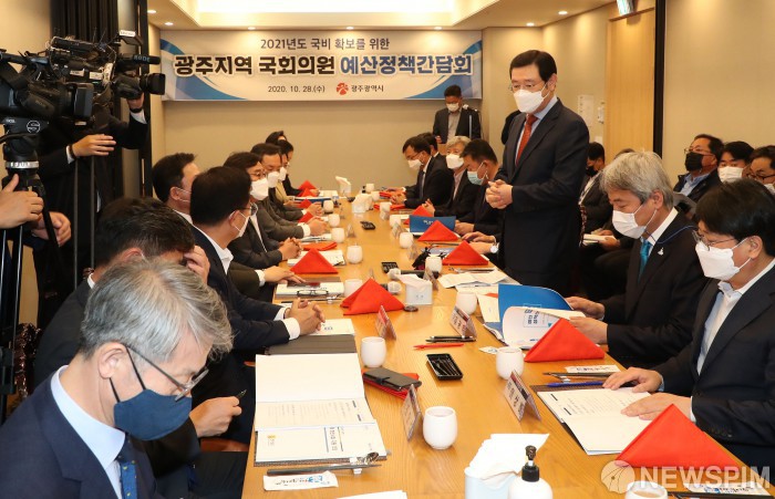 [서울=뉴스핌] 이형석 기자 = 28일 서울 영등포구 여의도의 한 식당에서 이용섭 광주시장이 광주지역 국회의원들과 예산정책간담회를 열고 있다. 2020.10.28 leehs@newspim.com