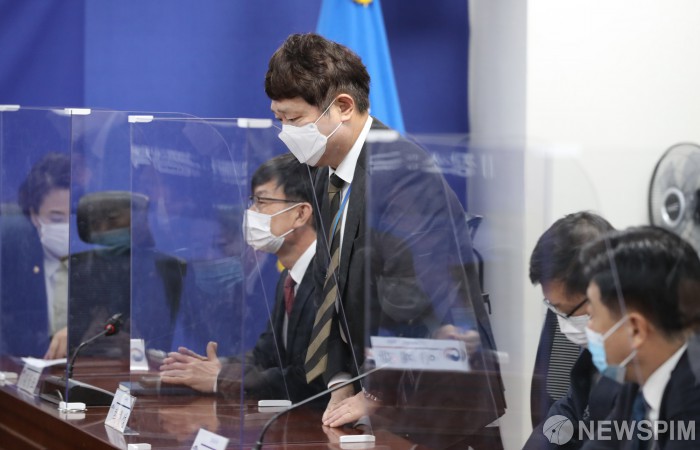 [서울=뉴스핌] 이형석 기자 = 최재성 청와대 정무수석이 12일 오전 서울 여의도 국회 의원회관에서 열린 필수노동자 보호 및 지원대책 당정청 협의회에서 인사하고 있다. 2020.11.12 leehs@newspim.com