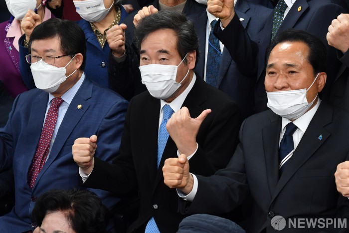 [서울=뉴스핌] 이형석 기자 = 12일 오전 서울 여의도 더불어민주당 당사에서 열린 전국노인위원회 발대식 및 임명장 수여식에서 이낙연 더불어민주당 대표 기념촬영 중 김손 전국노인위원장을 가리키는 제스처를 하고 있다. 2020.11.12 leehs@newspim.com