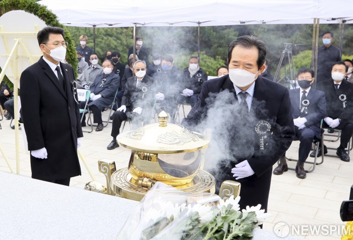 [서울=뉴스핌] 국회사진취재단 = 정세균 국무총리가 20일 서울 동작구 국립서울현충원 김영삼 대통령 묘역에서 열린 5주기 추모식에서 헌화 및 분향하고 있다. 2020.11.20 photo@newspim.com