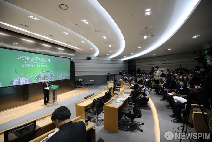 [서울=뉴스핌] 백인혁 기자 = 김용범 기획재정부 제1차관이 26일 오후 서울 영등포구 KDB산업은행에서 열린 그린뉴딜 투자설명회에서 축사를 하고 있다. 이번 투자설명회는 그린 뉴딜 중에서도 친환경 미래차와 녹색 산업 분야에 관한 것으로, 전기·수소차 투자 활성화를 위한 정책 방향, 그린 중소·벤처기업 혁신 성장 지원 방안, 시중 유동성을 녹색 산업으로 유도하는 녹색 금융 활성화 방안 등에 관한 설명이 진행됐다. 2020.11.26 dlsgur9757@newspim.com