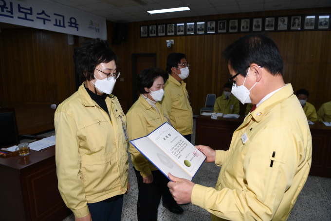 | 한정우 창녕군수(오른쪽 첫 번째)가 1일 군청 군정회의실에서 하은영 노인여성아동과장(맨 왼쪽)에게 2020년 아동·여성안전지역연대 우수기관 선정 경남도지사 기관표창을 전달하고 있다.[사진=창녕군] 2020.12.02 news2349@newspim.com |