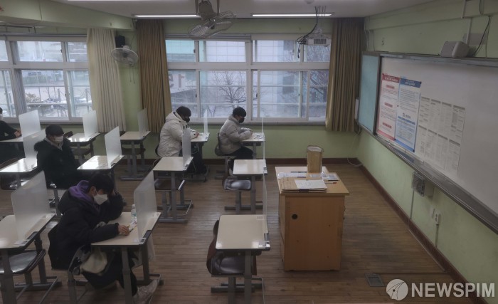 [서울=뉴스핌] 사진공동취재단= 2021학년도 대학수학능력시험(수능)일인 3일 오전 서울 서초구 서초고등학교에 마련된 수능 고사장에서 수험생들이 시험 시작을 기다리고 있다. 2020.12.03 photo@newspim.com