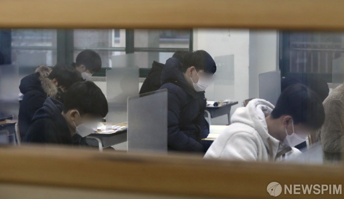 [서울=뉴스핌] 사진공동취재단 = 2021학년도 대학수학능력시험이 치러진 3일 오전 서울 종로구 경복고등학교 고사장에서 수험생들이 시험을 앞두고 자습하고 있다. 코로나19 여파로 2주 늦춰진 이번 수능은 역대 최소인 49만3433명이 응시한 가운데 전국 86개 시험지구 1383개 시험장에서 일제히 치러진다. 2020.12.3 photo@newspim.com