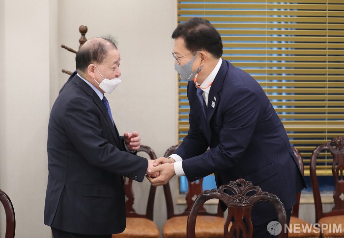 [서울=뉴스핌] 최상수 기자 = 강창일 주일대사 내정자가 8일 오전 서울 여의도 한 일식당에서 열린 더불어민주당 한반도 태스크포스(TF) 초청 간담회에 참석, 송영길 위원장과 인사를 나누고 있다. 2020.12.08 kilroy023@newspim.com