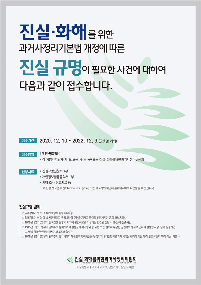 진실규명 신청 기간은 2020년 12월 10일부터 2022년 12월 9일까지 2년간이며, 신청서를 작성해 가까운 시·도청이나 시·군·구청, 또는 서울에 소재하고 있는 진실화해위원회에 직접 방문해 제출하거나 우편 등을 이용해 제출할 수 있다.