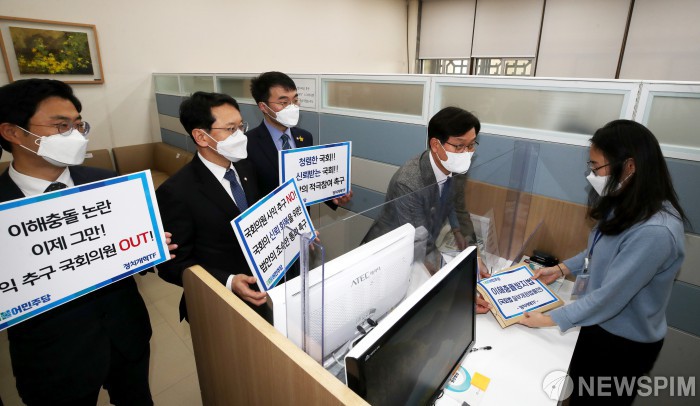 [서울=뉴스핌] 최상수 기자 = 신동근 단장을 비롯한 더불어민주당 정치개혁 TF가 21일 오후 국회 본청 의안과에 이해충돌방지법을 제출하고 있다. 2020.12.21 kilroy023@newspim.com